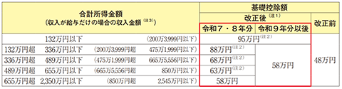 次の図のとおり、合計所得金額に応じて基礎控除額が改正されました。