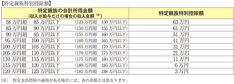 特定親族とは、同一生計である19歳以上23歳未満の親族のうち、合計所得金額が58万円超123万円以下(給与収入のみの場合、年収123万円超188万円以下)の方です。この特定親族について特定親族特別控除を申告する方は、下記の控除額が適用されます。